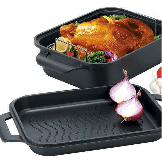 This 2-piece cookware set features a roaster with a metal rack. The non-stick coating allows for cooking with minimal addition of fat and makes clean up easy. The die-cast aluminum lid can be used as a BBQ grill pan. This roaster set is simply