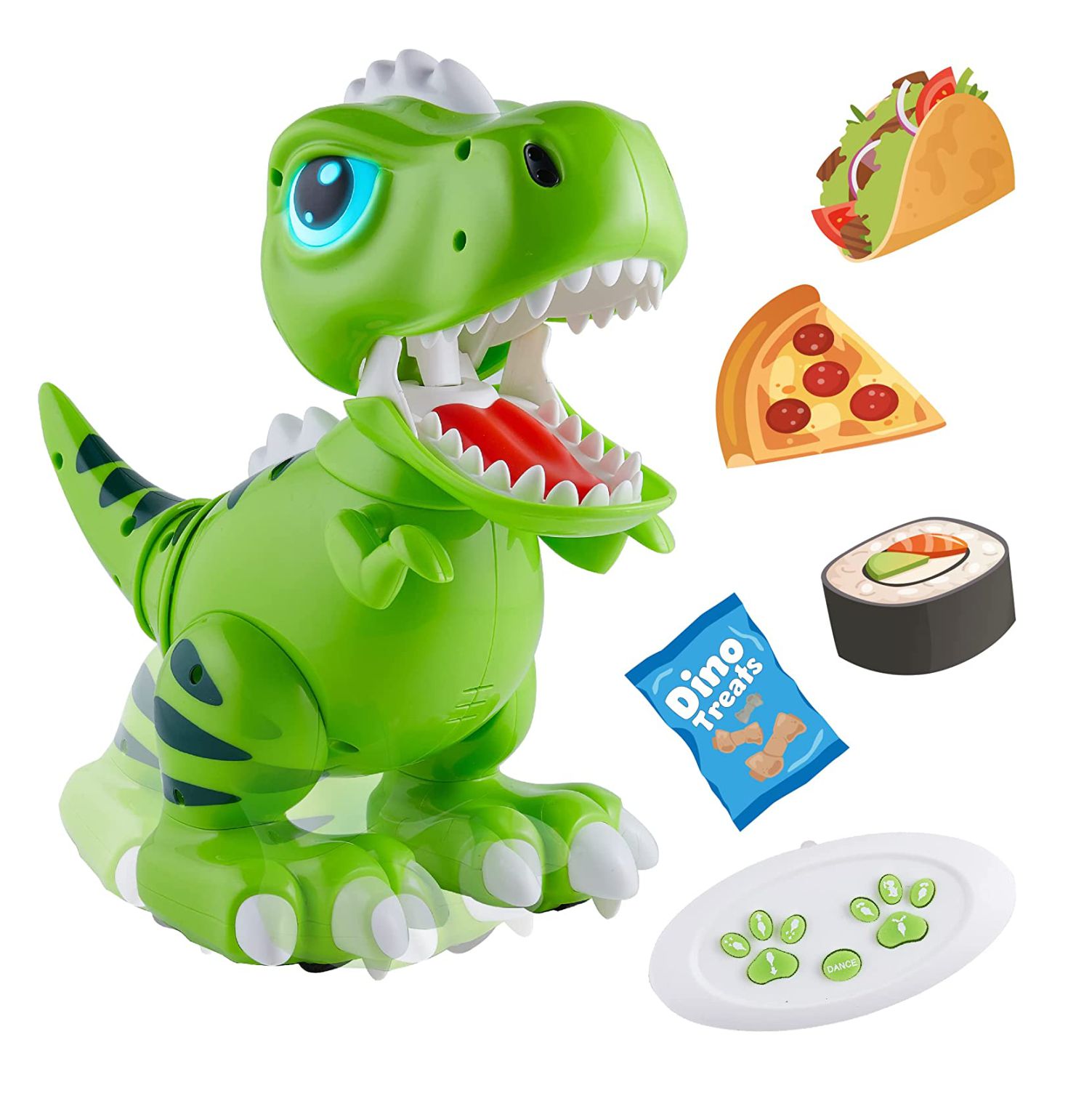 Multiplayer RC Robot Dinosaur: In Gesture Mode, put your hand inside this RC robot’s mouth and avoid getting chomped on; play with another person and have them place a hand behind your electronic pet’s head while you have your hand inside the dino’s mouth, avoid getting chomped on while the other player move their hand away from your robot pet