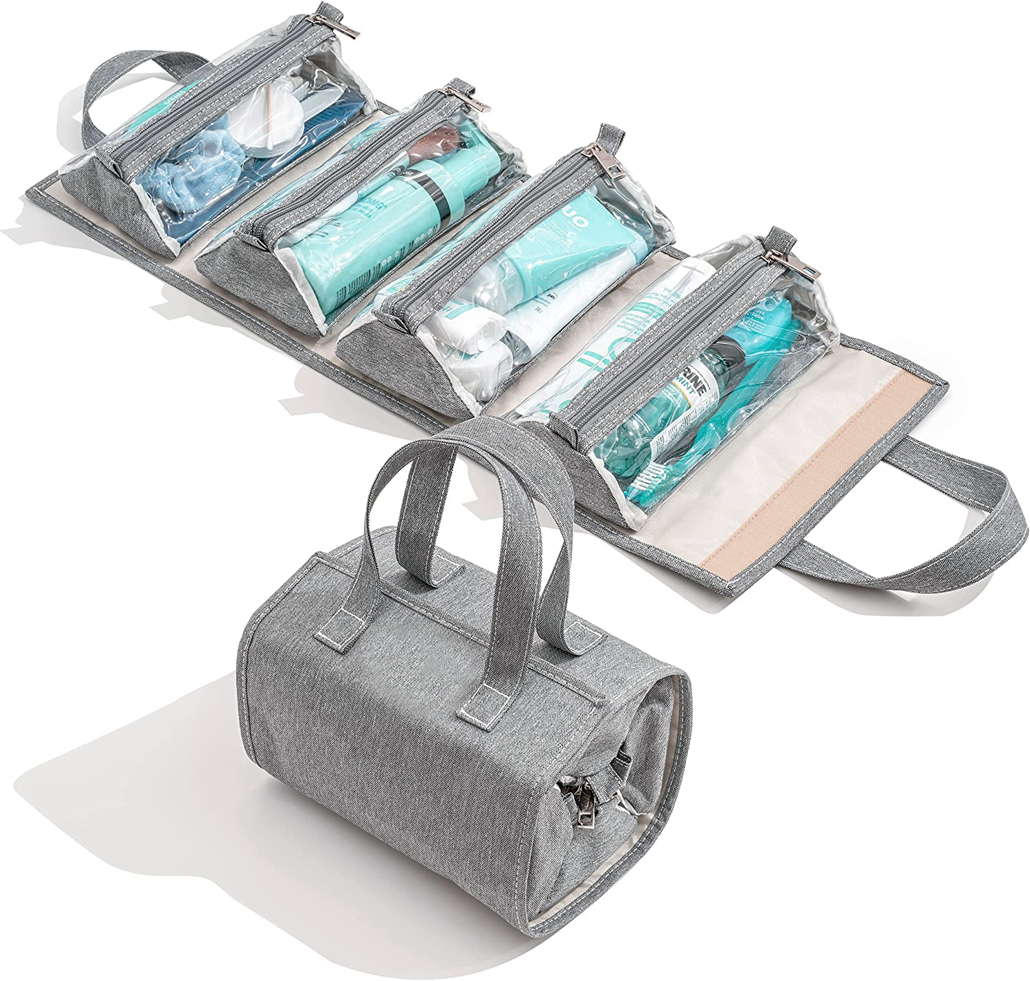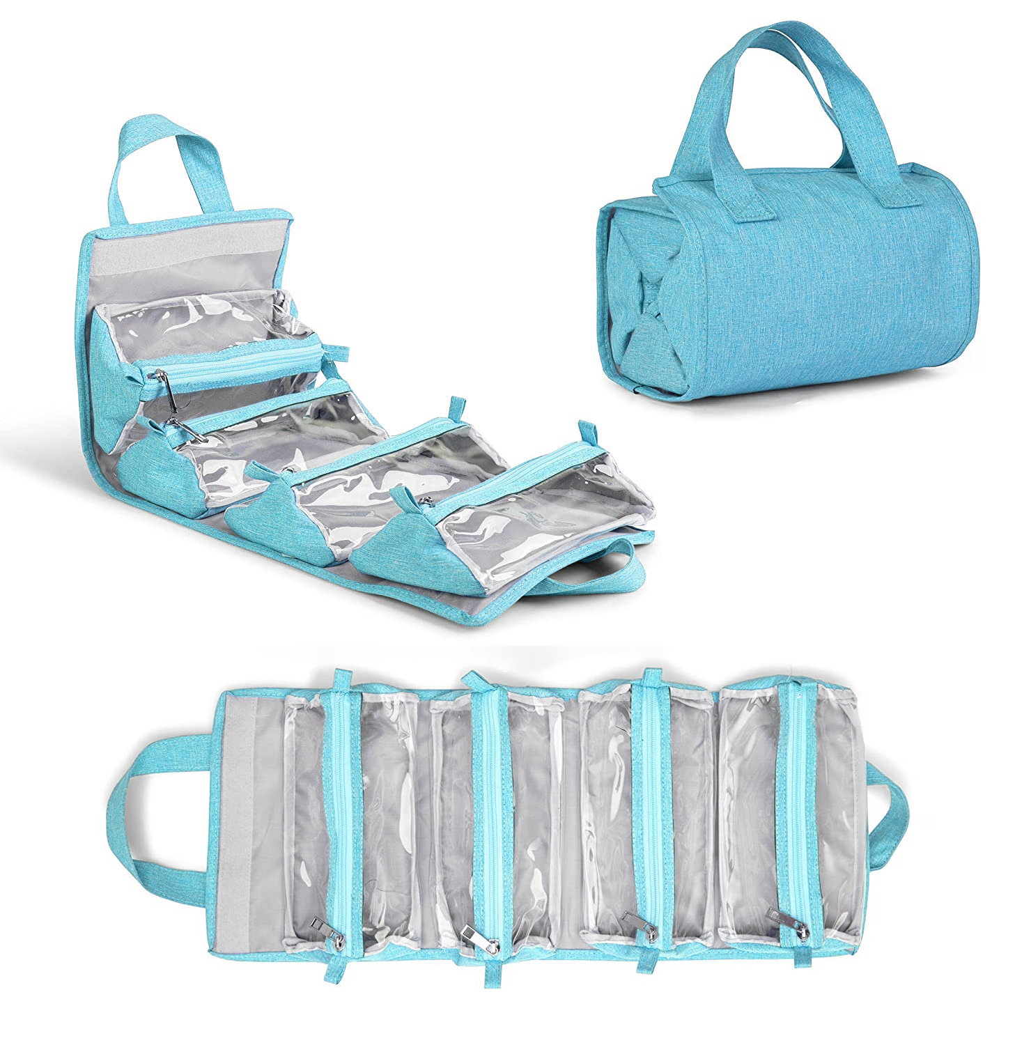 - The sturdy handle makes it easy to take the wash bag everywhere, such as the bathroom, gym, makeup room and beach. The hanging and visual design of our travel toiletries bags make fast access to get the things in the four layers at just a glance. With its compact size and large capacity, this makeup travel bag saves your luggage space for easy carrying.