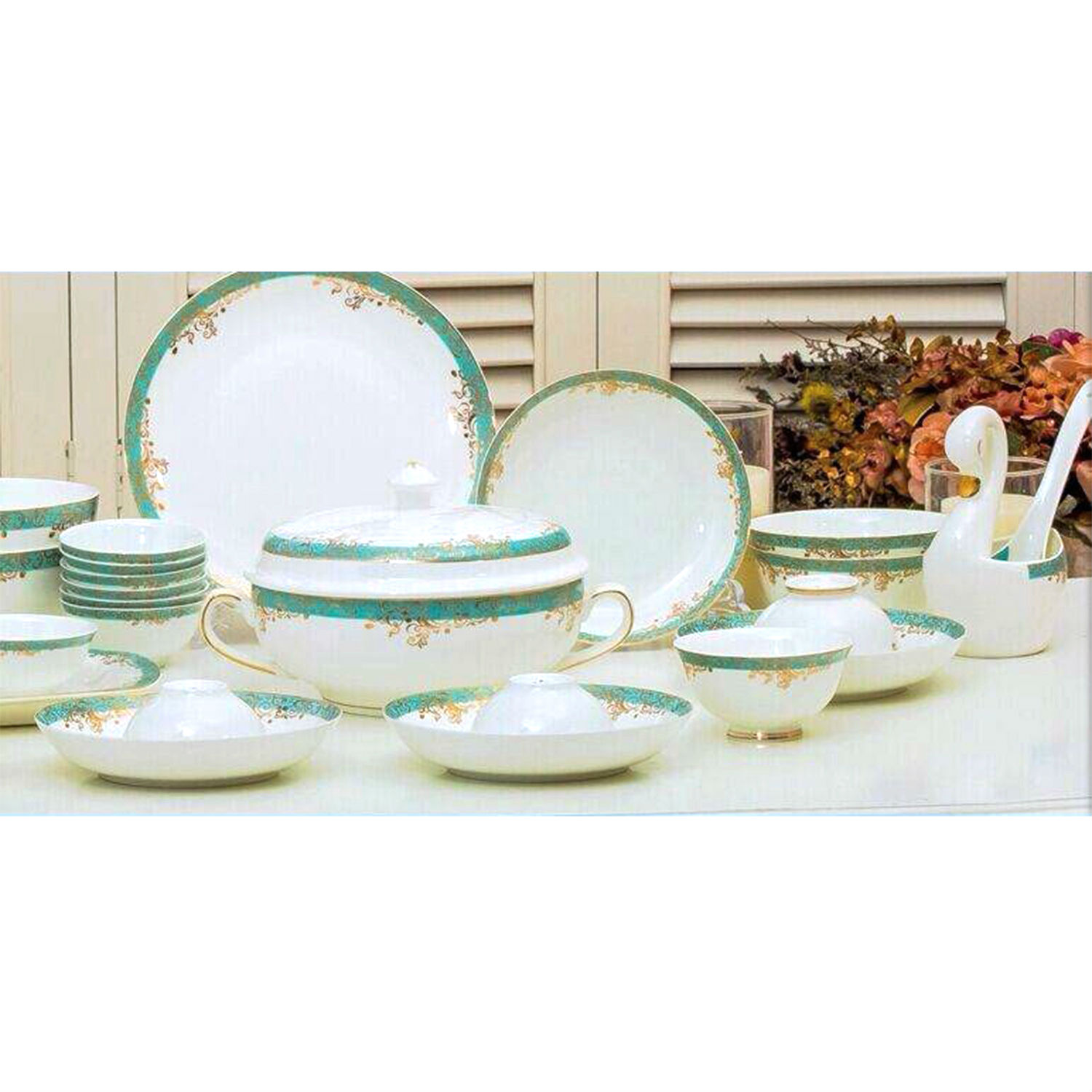 Enhance the appearance of your food with this tableware set. The refreshing green-toned outer borders are complemented by light hued centers. The 56 pieces can easily serve at least five people at one time. With gold-colored embellishments, this tableware set gives your table setting a warm and inviting vibe.