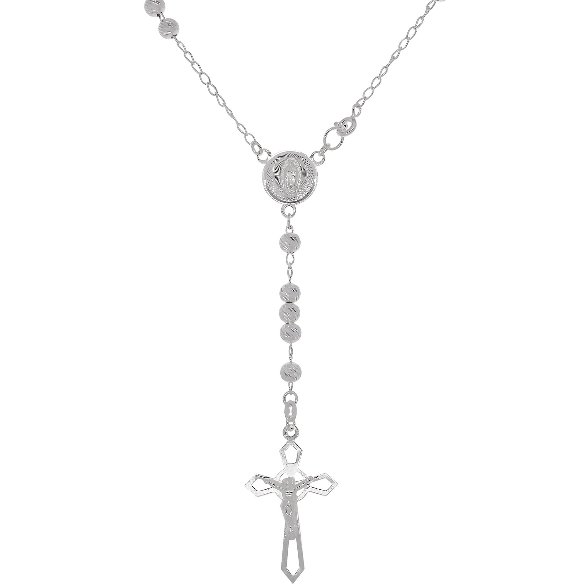 This premium 5mm rosary is designed with precision, featuring diamond-cut beads that provide an elegant shine and refined appearance. The centerpiece showcases a beautifully detailed Virgin Medal, adding a religious and meaningful element to the piece. The rosary is finished with a durable spring ring clasp for secure fastening and easy use.