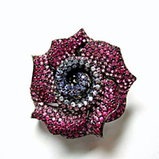 This ladies' brooch gives out a sophisticated feeling with its rose design. The fabulous color is created by quality ruby and sapphire stones. The brilliant craftsmanship makes this brooch sparkle under lighting effect.
