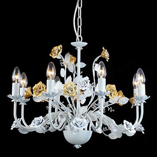 This spray painted rose chandelier boasts a modern, exquisite design in white. The golden roses easy stand out from the rest and delight the overall design. The candle light bulbs stand beautifully on curvy arms.