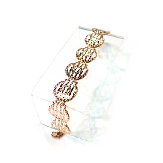This rose gold bracelet comes with an elegant design. The lustrous piece features sophisticated cut-outs on its surface. The well-designed bracelet is a great addition to your jewelry collection.