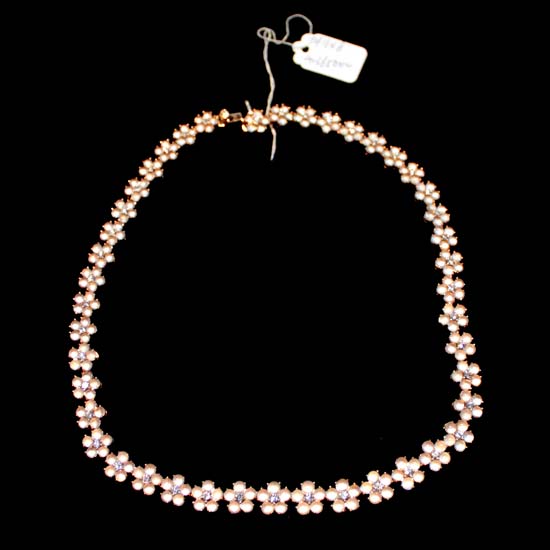 Ladies will love the feminine design of this rose gold necklace. Every flower has white jade glass and loose diamonds paved on its petal. Brilliant craftsmanship fills this necklace with a sense of elegance.