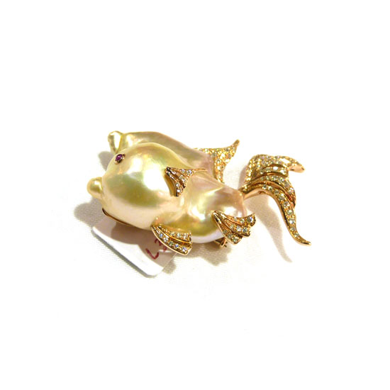 This exquisite brooch is remarkable for its fish-shaped design. A golden pearl forms the fish body for extraordinary charm. The fins and tail are meticulously crafted with rose gold and loose diamonds for a shimmering touch.