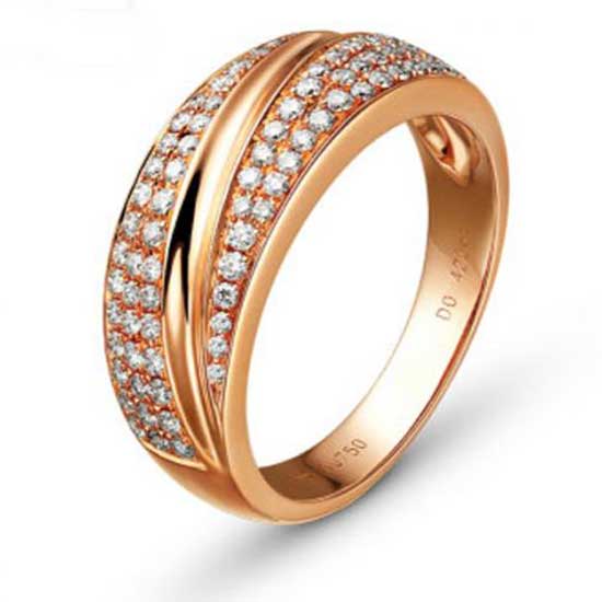 This rose gold ring comes with a simple twisting construction. Shimmering diamond settings add glamor and elegance to the entire piece. Enhance your evening dress in brilliance with this fine rose gold ring.