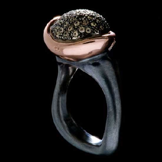 The rose gold finger ring is characterized by its engaging irregularity. The rose gold decoration on top features plenty white diamonds for a shimmery effect. The ring also comes with a dark-colored band made of quality silver.