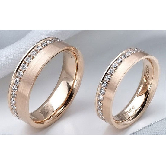 Featured here is a charismatic pair of wedding ring made in rose gold. A row of fine sparkling stones adorns this ring with a sweet, romantic touch. These beautiful rings represent the lasting love and care of couples.