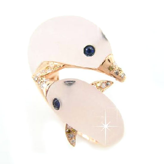 This delicate rose quartz ring is crafted in the shape of a pair of dolphins facing each other. Expensive materials such as diamonds and 18K gold are added to elevate the charm of the ring. This fancy jewelry is a clean, delightful gift for ladies.