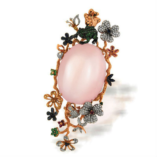 - Material: 18K rose gold, rose quartz, sapphires, Swiss blue topaz, diamonds.