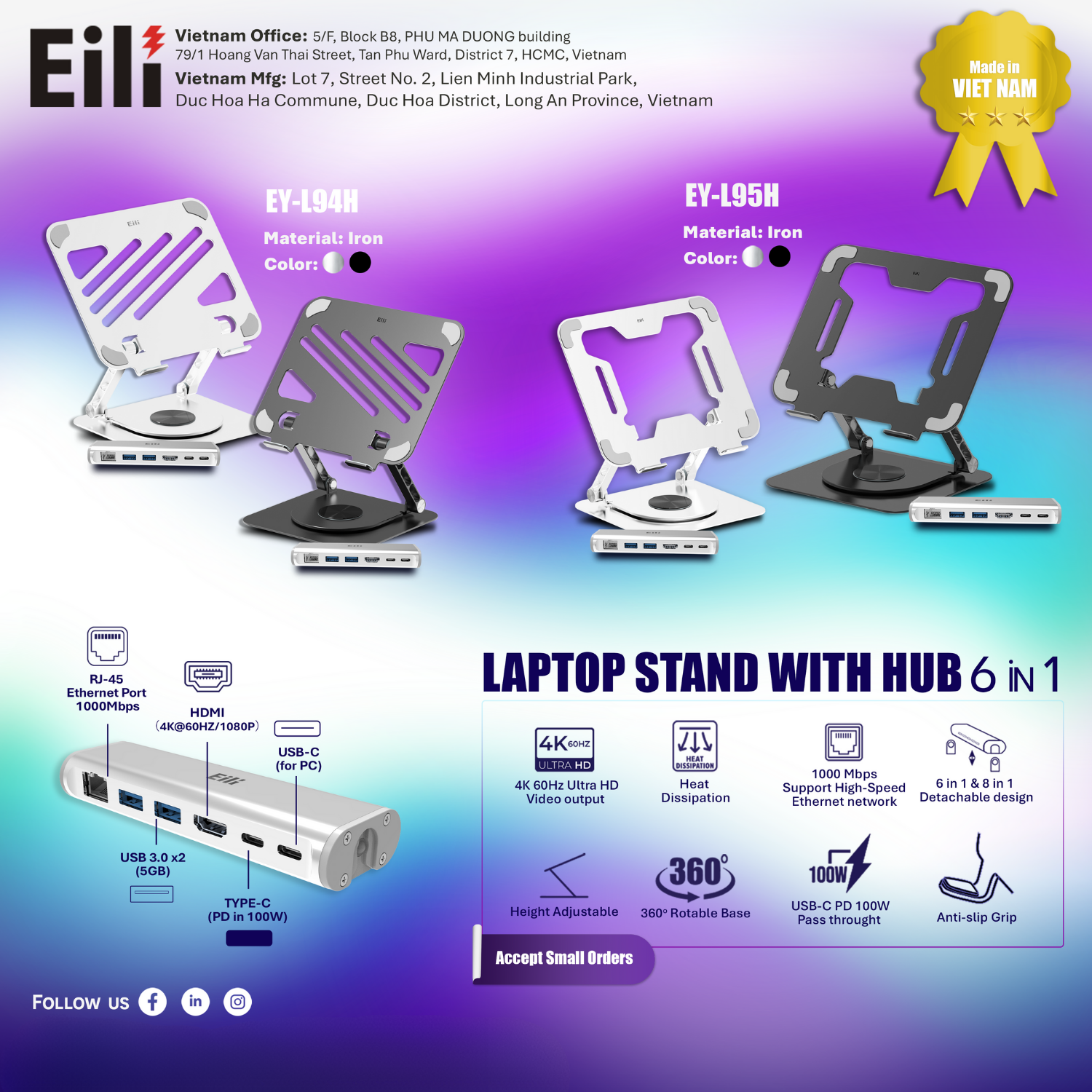 The Ergonomic Rotating Laptop Stand with Detachable USB-C Hub is designed to improve comfort and productivity. With adjustable height, a 360° rotating base, and a heat dissipation design, it ensures optimal viewing angles and enhanced laptop cooling. The integrated hub provides seamless connectivity, making it an ideal all-in-one solution for office, study, or creative work. Available in 6-in-1 (standard) and 8-in-1 (optional) hub versions, this stand combines ergonomics, durability, and modern style.