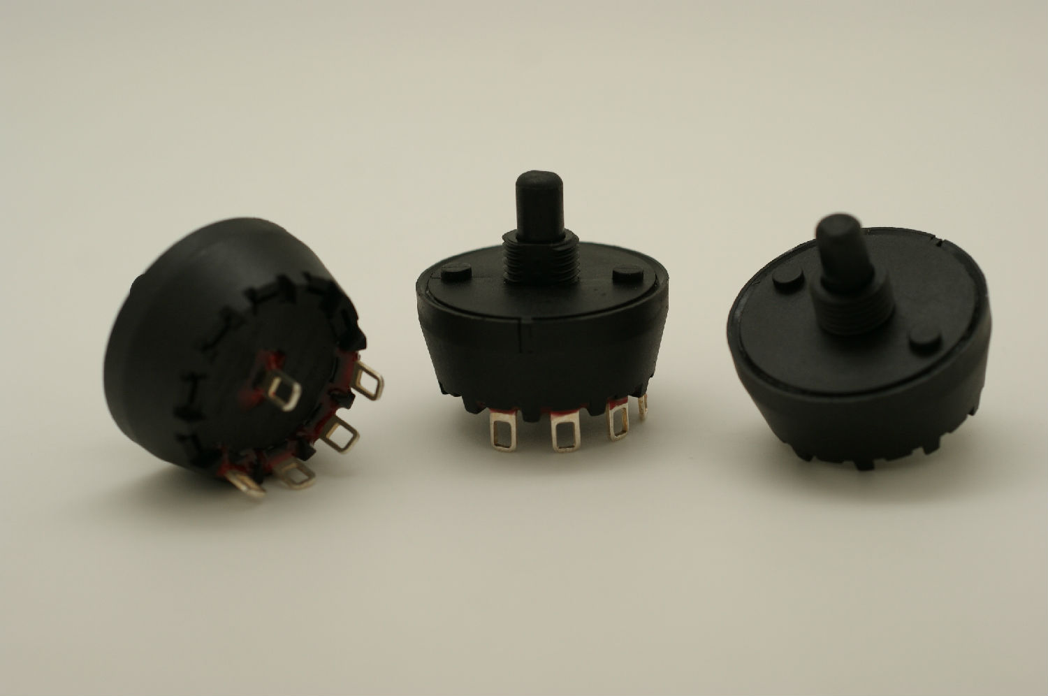 0-10 positions power rotary switch, with certification of CUL, ENEC17, CB, CQC; can be equipped with knobs. Its actuator in PA66+30%GF(UL 94V-0), cap in Nylon66(UL 94V-0), base in Nylon66(UL 94V-0), terminal in Brass/Copper alloy silver-plated. Features: The switch has 45 degrees and 36 degrees for seach position. Panel cutout dimension is 22mm. The maximum outer diameter is 32mm.