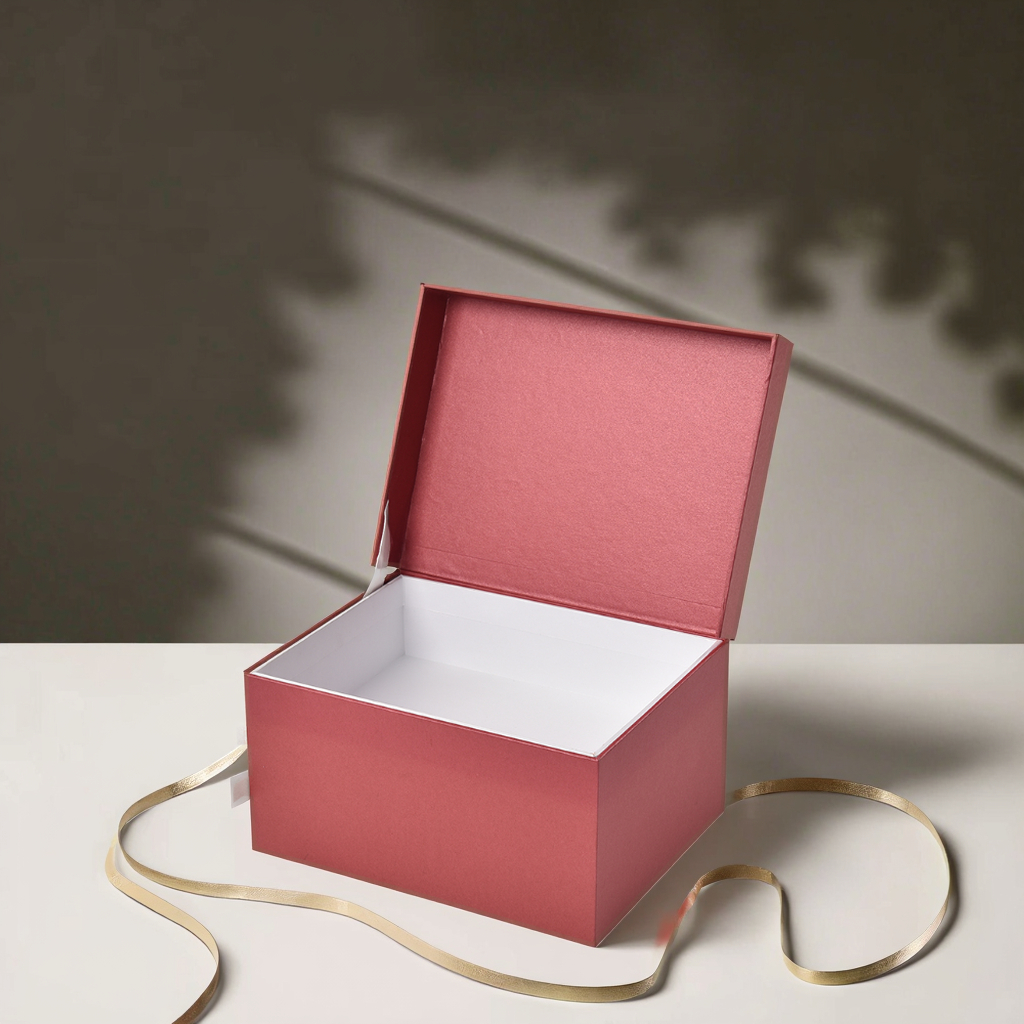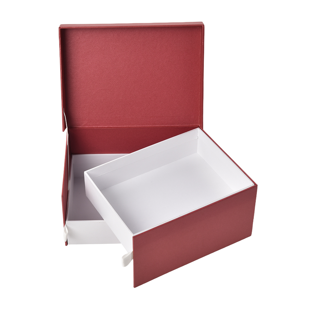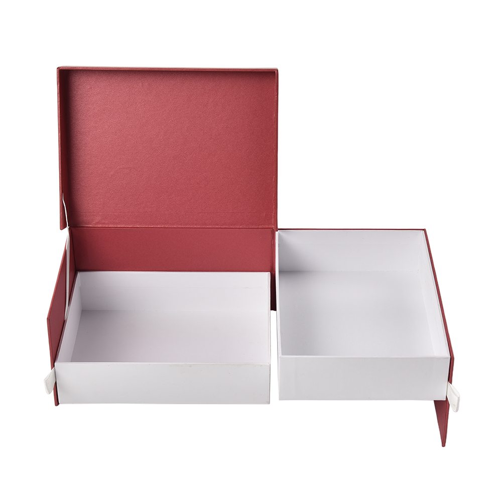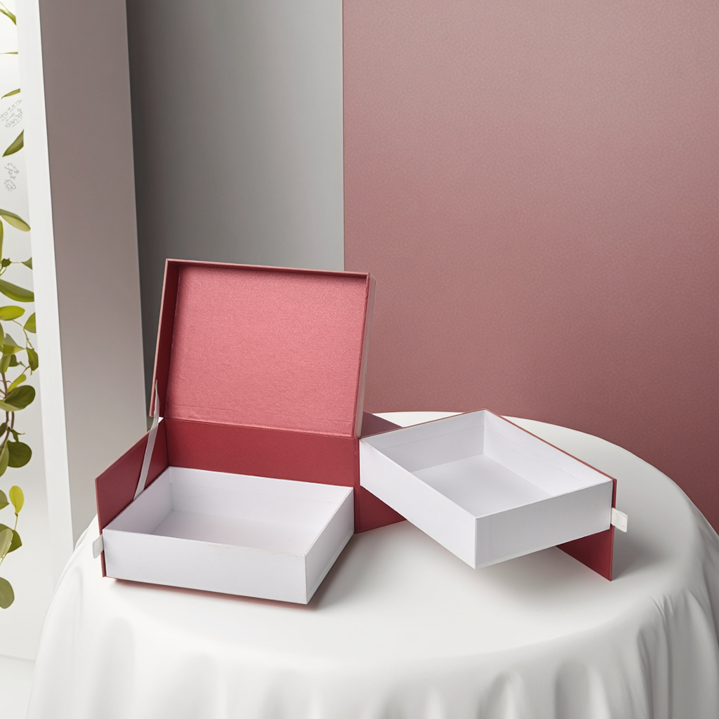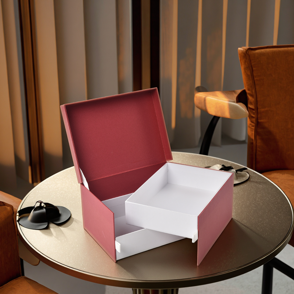 An innovative double-layer rotating drawer gift box with both high-end gift box and practical storage functions. The outer box is thickened cardboard in wine red, and the drawer layer is white. Built-in magnetic closure, smooth and elegant rotation and opening. The inner lining can be customized into sections to perfectly store exquisite items such as cosmetics and jewelry. Support full-dimensional personalized customization.