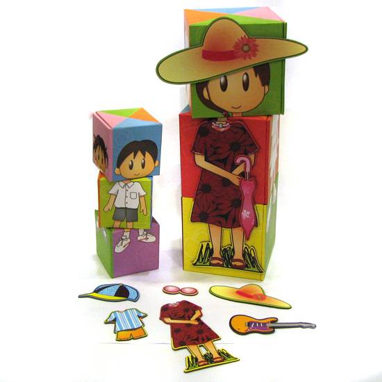 This rotational puzzle features cut-out, magnetic clothes pieces in high quality print outs, which can be stuck on different cube faces. As each cube is in a different colour, turning and mixing the dresses of these characters is a fun game for children.