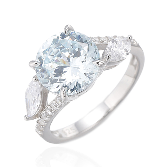 Round Aquamarine And Marquise White Cubic Zircon Rhodium Silver Ring