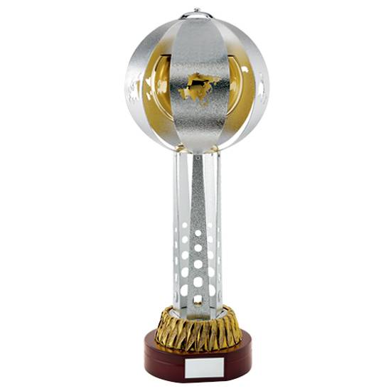 This trophy flaunts a delicately made sphere with shiny, coated patterns. The top is supported by five strips with circular cut-out patterns. The trophy comes with a stable round base.