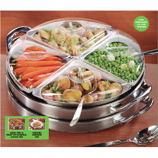 This round buffet warmer comes with top-quality stainless steel serving trays. The 4-compartment design of the tray allows you to place the food neatly. This buffet warmer can also be put in an oven and on a stove.
