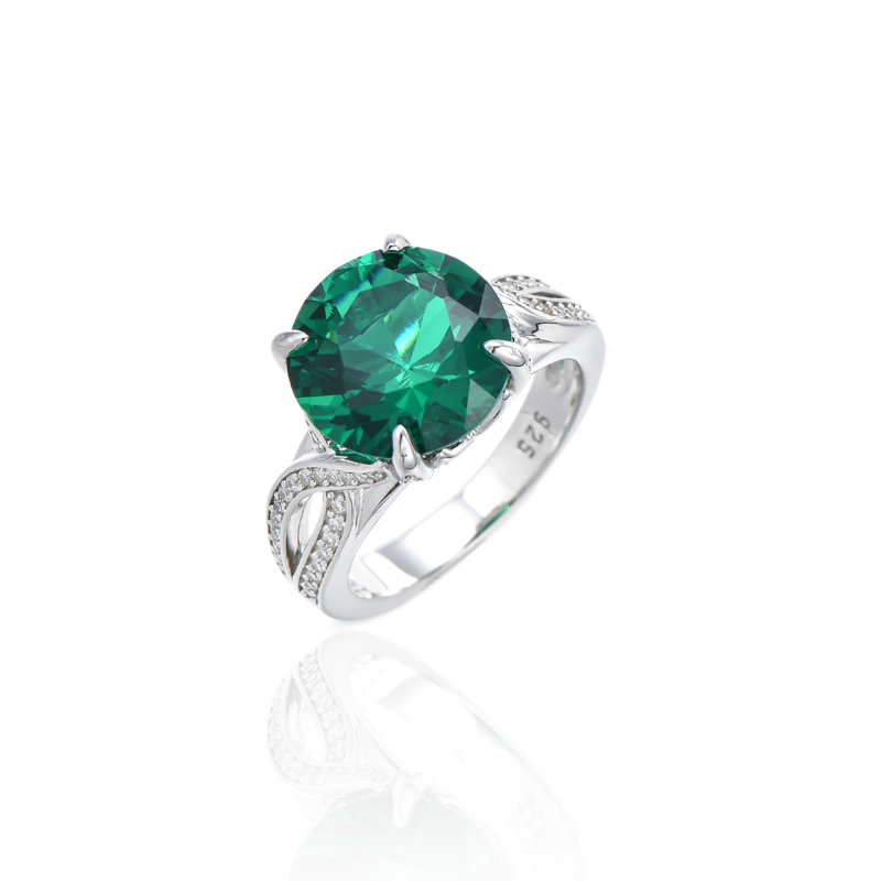 Round Green Nano And White Cubic Zircon Rhodium Silver Ring