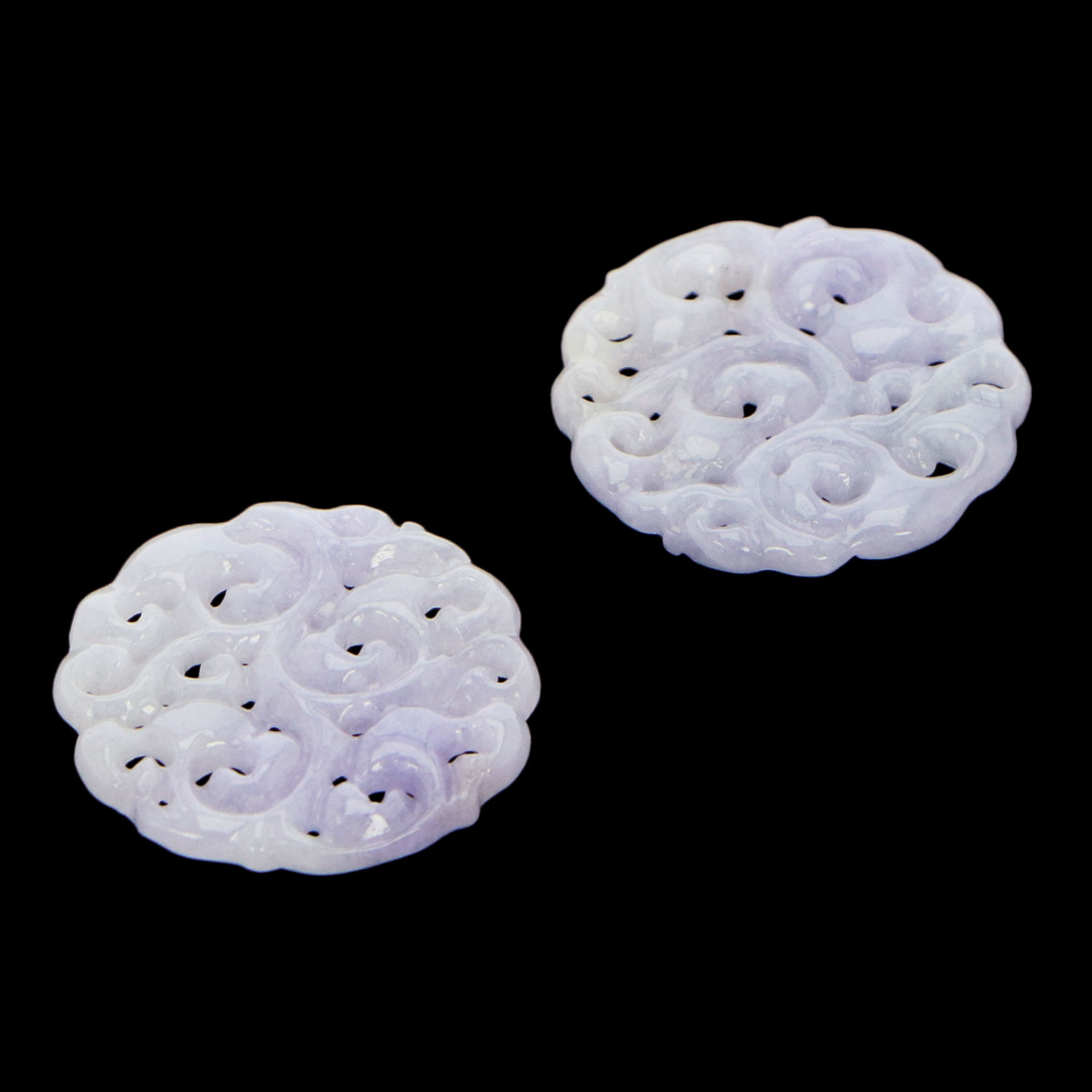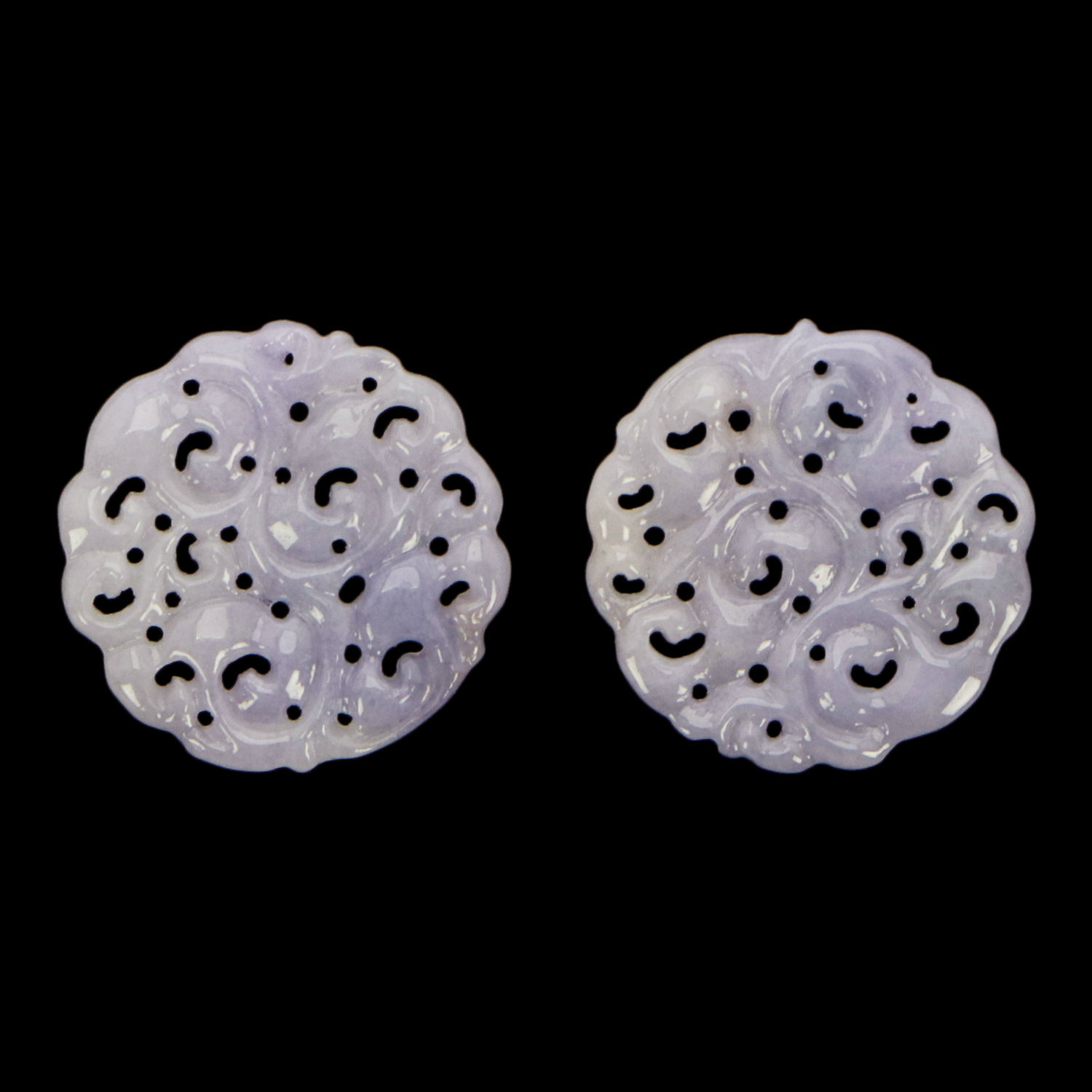 Oozing a captivating and oriental aura, this pair of lavender jadeite jade earrings is the finishing touch to all minimalistic evening edits. Meticulously handcraft in a classic round silhouette, this pair is enriched by subdued swirl-like carvings for a refined and polished look. The jadeite jade’s luminosity and color are best displayed with its plate-like design. Bring an exotic and feminine air to cocktail ensembles with this delicate number.