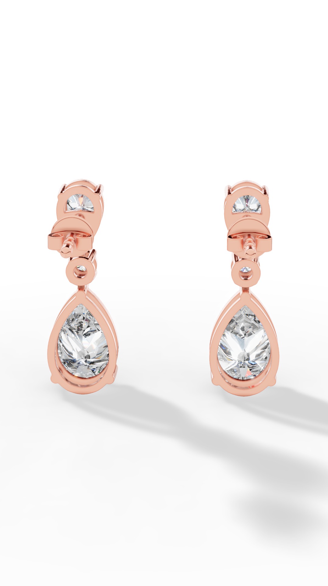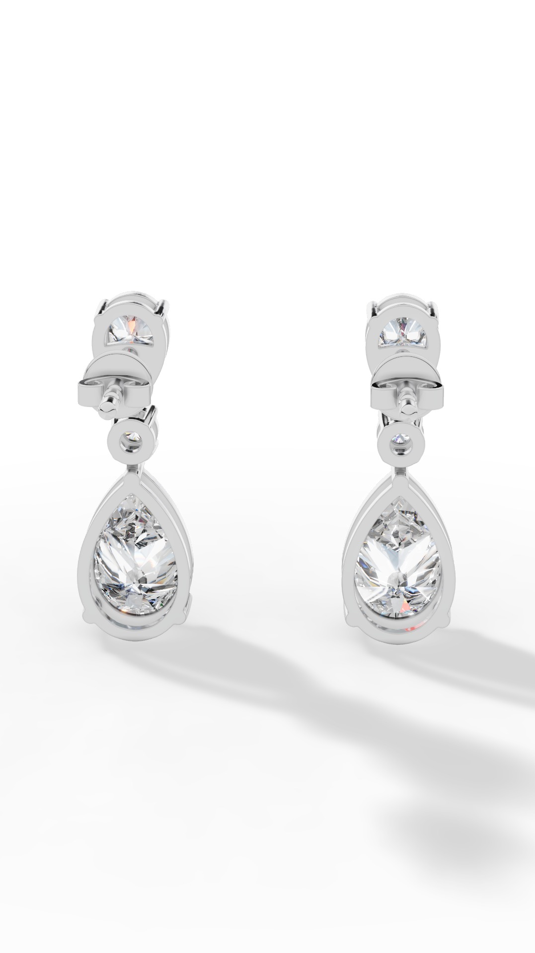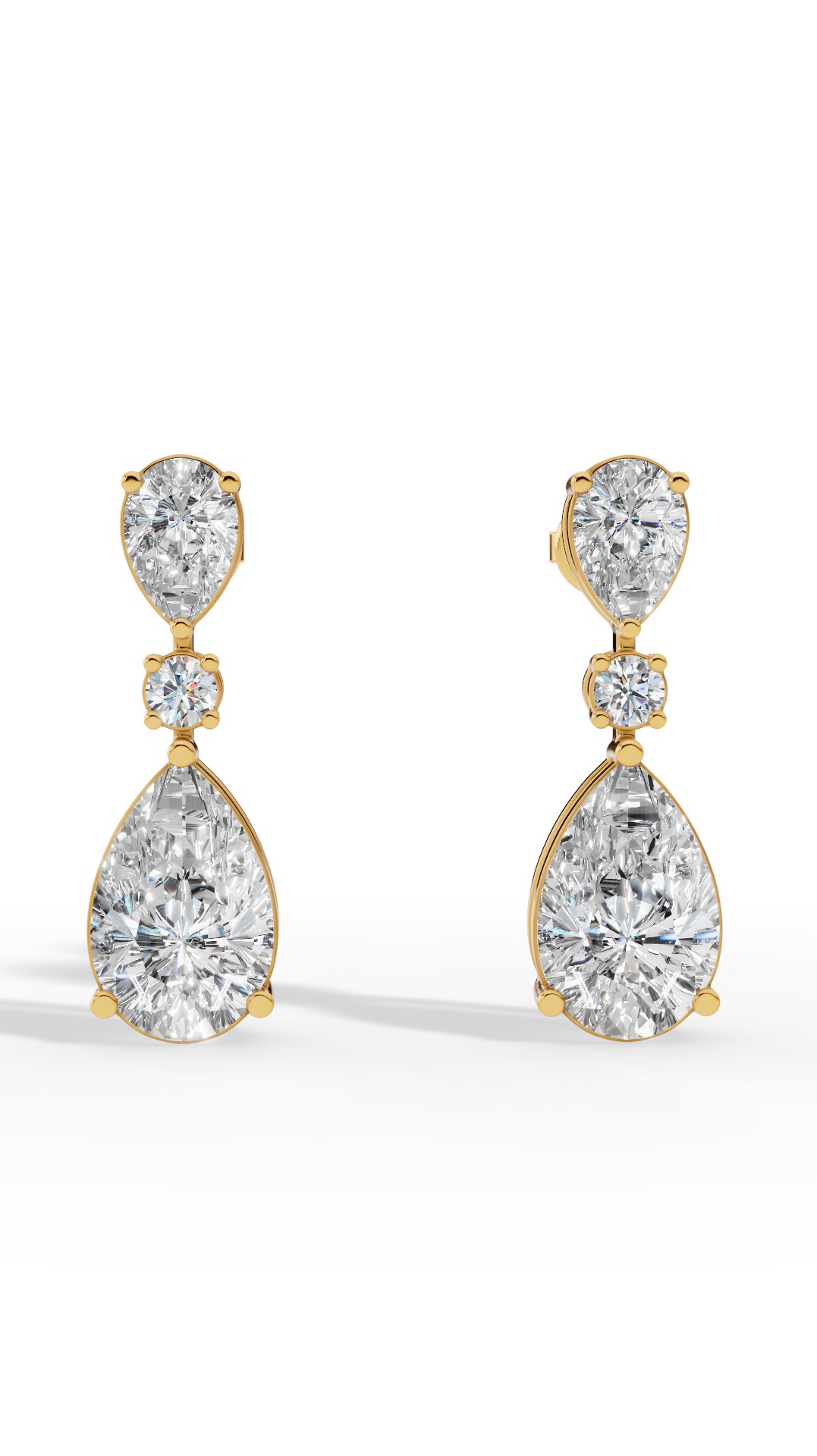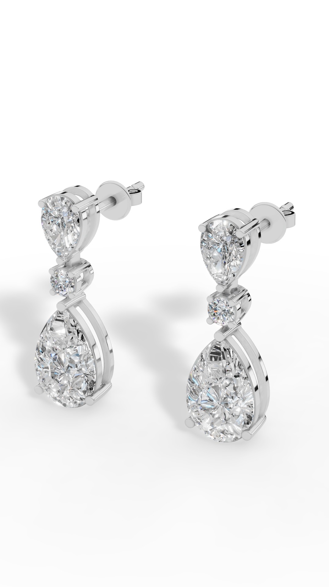 The drop earrings feature a stunning combination of round and pear cut solitaire, elegantly cascading to create sparkling movement and timeless sophistication for any occasion.