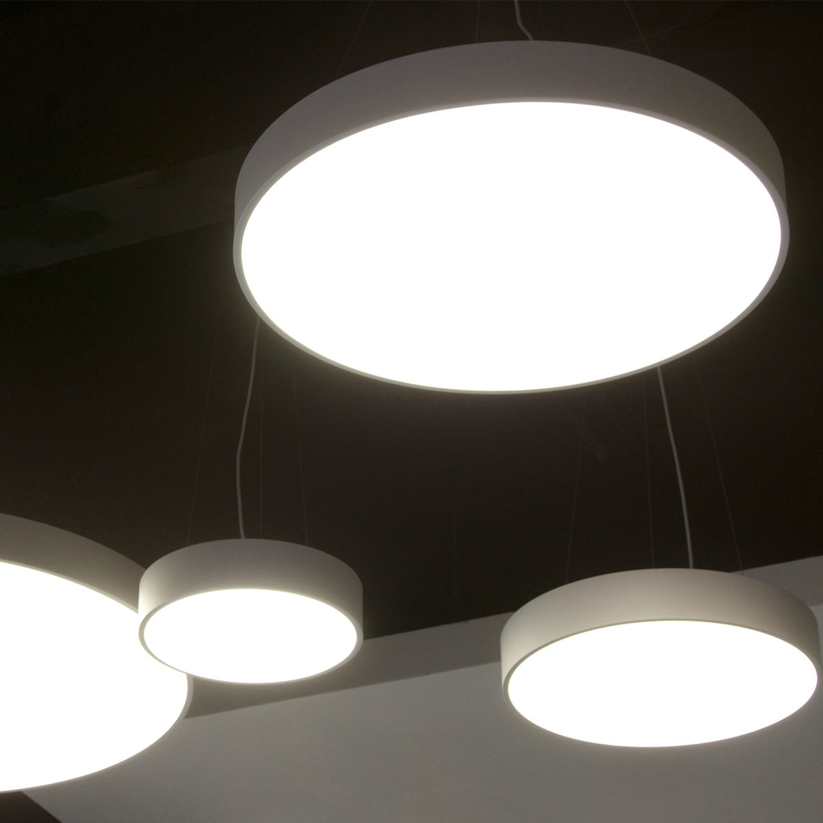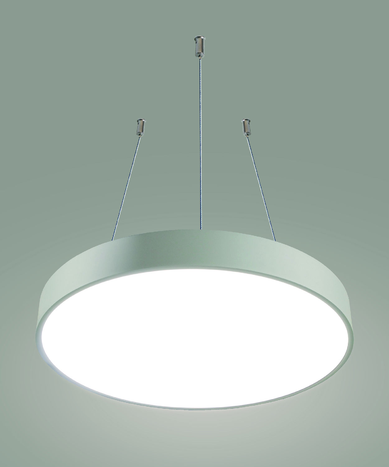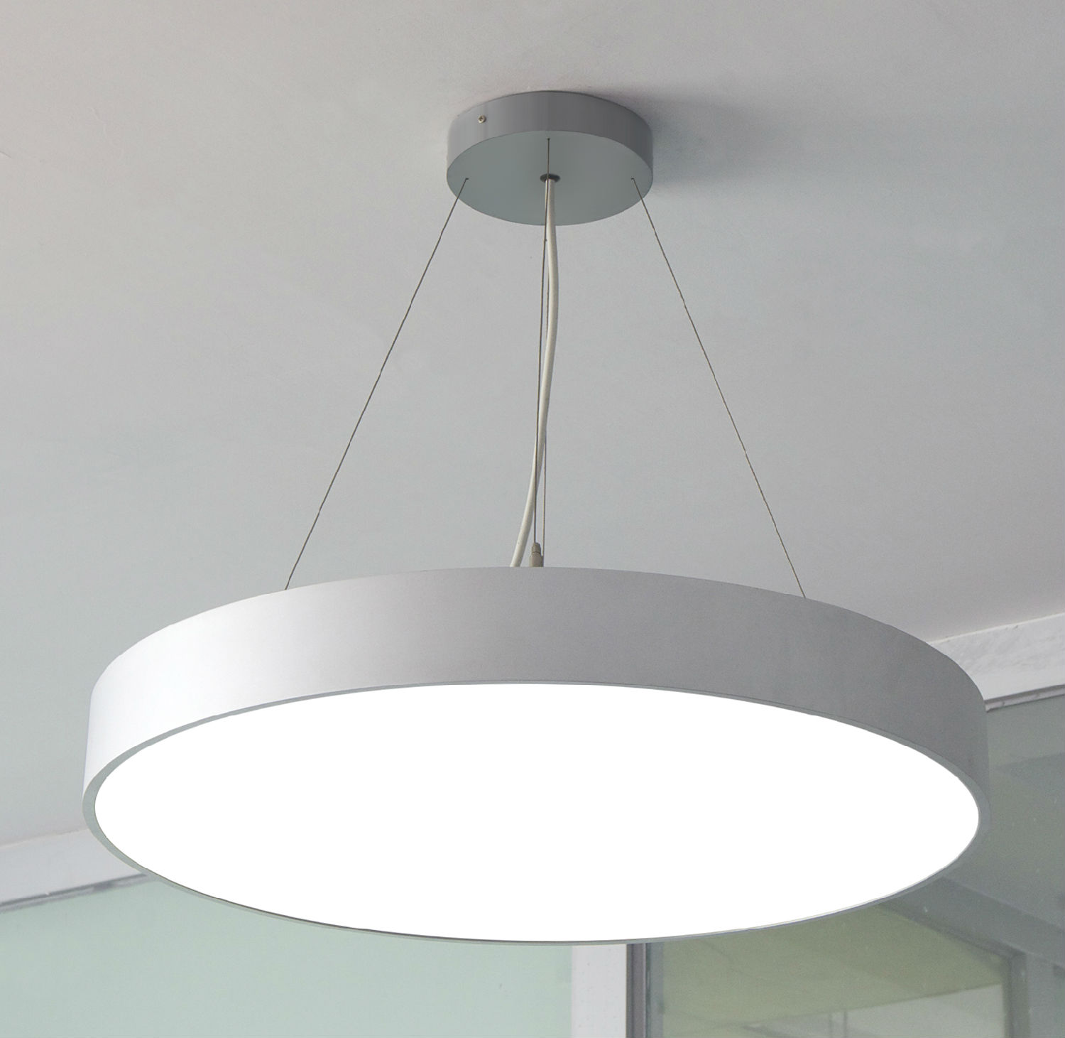 Round Suspension LED Panel Light, Type Size Ø60cm, Construction Size Ø600X105mm, Rated Input: 90-250V~, 50/60Hz, Total Output Power: 46.8W, 156pcs of Samsung SMD 0.2~0.5W LED work at 0.3W, Kelvin can be 5,500 to 7,000K (Pure White), 4,000 to 4,500K (Daylight White) or 2,700 to 3,500K (Warm White) by order, calculated total 5,288lm Max., PMMA Diffuser, Aluminium Rolling Frame.Current Constant Power Supply, Ceiling-Mounted set and 1.4mX3 stainless steel wires and 1.5m power cable for installation included