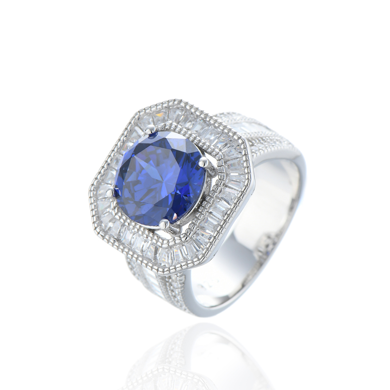 Round Tanzanite And White Cubic Zircon Rhodium Silver Ring