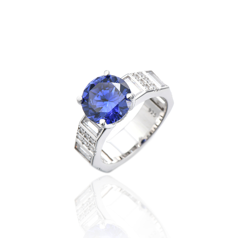 Round Tanzanite And White Cubic Zircon Rhodium Silver Ring