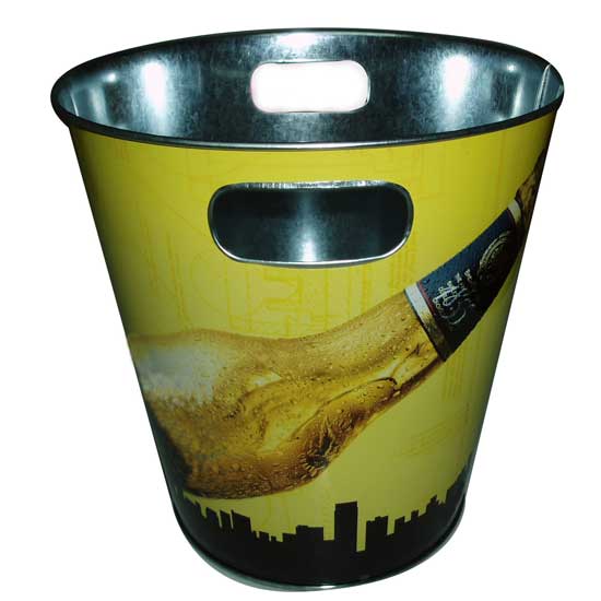 Highlighted is a round tin bucket with a tapered body. The exterior is fully 4-color offset-printed for decorative and promotional functions. The hollowed handles add ease to carrying.
