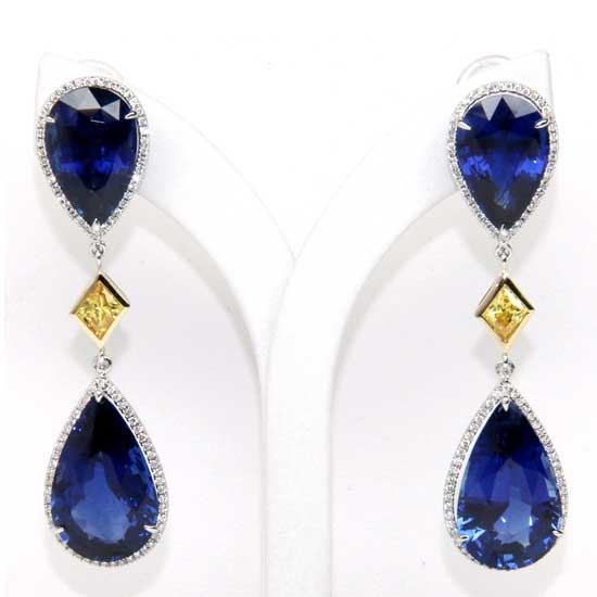 This is a pair of earrings boasting a chic and deluxe design. Each piece comes with two pear-cut sapphire stones in royal blue with sparkling stone elements. The fancy vivid yellow diamond complements this design for added luxuriousness.