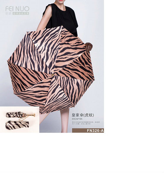 Featured here is compact umbrella with a classy and elegant design. It is adorned with tiger patterns on the canopy and has a slim straight handle for carrying. This umbrella comes with a matching pouch for storage and is convenient to carry around.