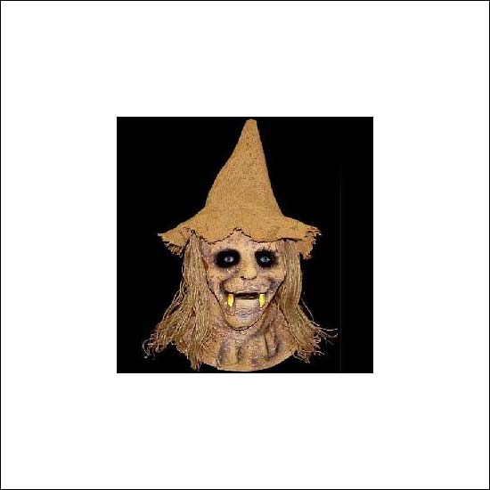 The highlighted Halloween mask is made of rubber and comes in a scarecrow design. It has a monster face with 2 sharp fangs and is wearing a pointed hat. This scarecrow mask offers a comfortable touch and is suitable for parties and Halloween use.