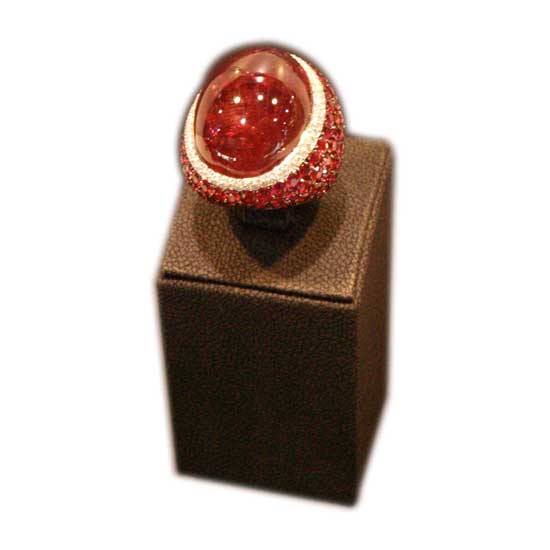 The rubilite stone ring features an 18K gold band. It is paved with rubies and diamonds for a glamorous touch. Add a touch of vibrant glister to your ensemble with this gorgeous 18K gold ring.