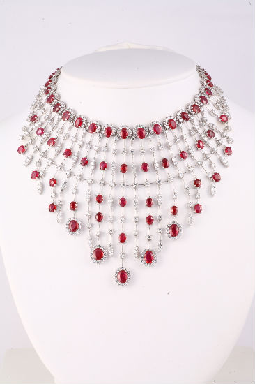 • Beautiful Burmese ruby and diamond soft necklace in 18K white gold.