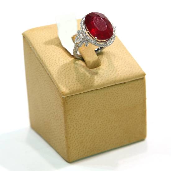 This is ruby and diamond ring for ladies and women. A brilliant-cut oval ruby is prong-set on top as the main stone of the ring. Round brilliant diamonds are set around the ruby and on the ring in micro pave setting, which accentuates its glamourous and gorgeous feature.