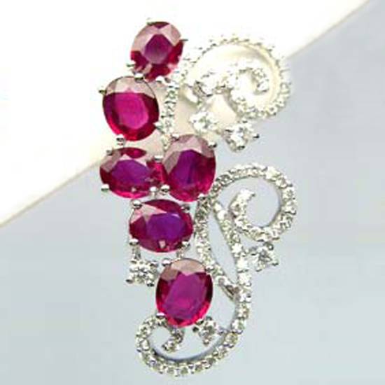 This is a pair of 18k white gold diamond earrings with rubies. It features three oval modified-brilliant-cut rubies in prong setting on each earring. It is decorated with multiple small round white diamonds set in white gold in a scroll pattern.