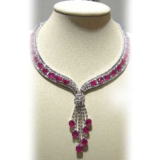 Displayed is a dainty necklace featuring a wide band and draping details. It is highlighted with rubies and diamonds for a brilliant touch. This elegant necklace is great for grand occasions.