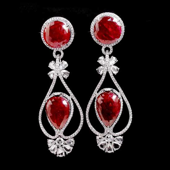 This pair of ladies’ earrings flaunts a dangling teardrop design with cut-out details and bow-shaped embellishments. The sparkling faceted rubies adorn the appearance with aristocratic grace. These captivating earrings are sure to glam up your ears.