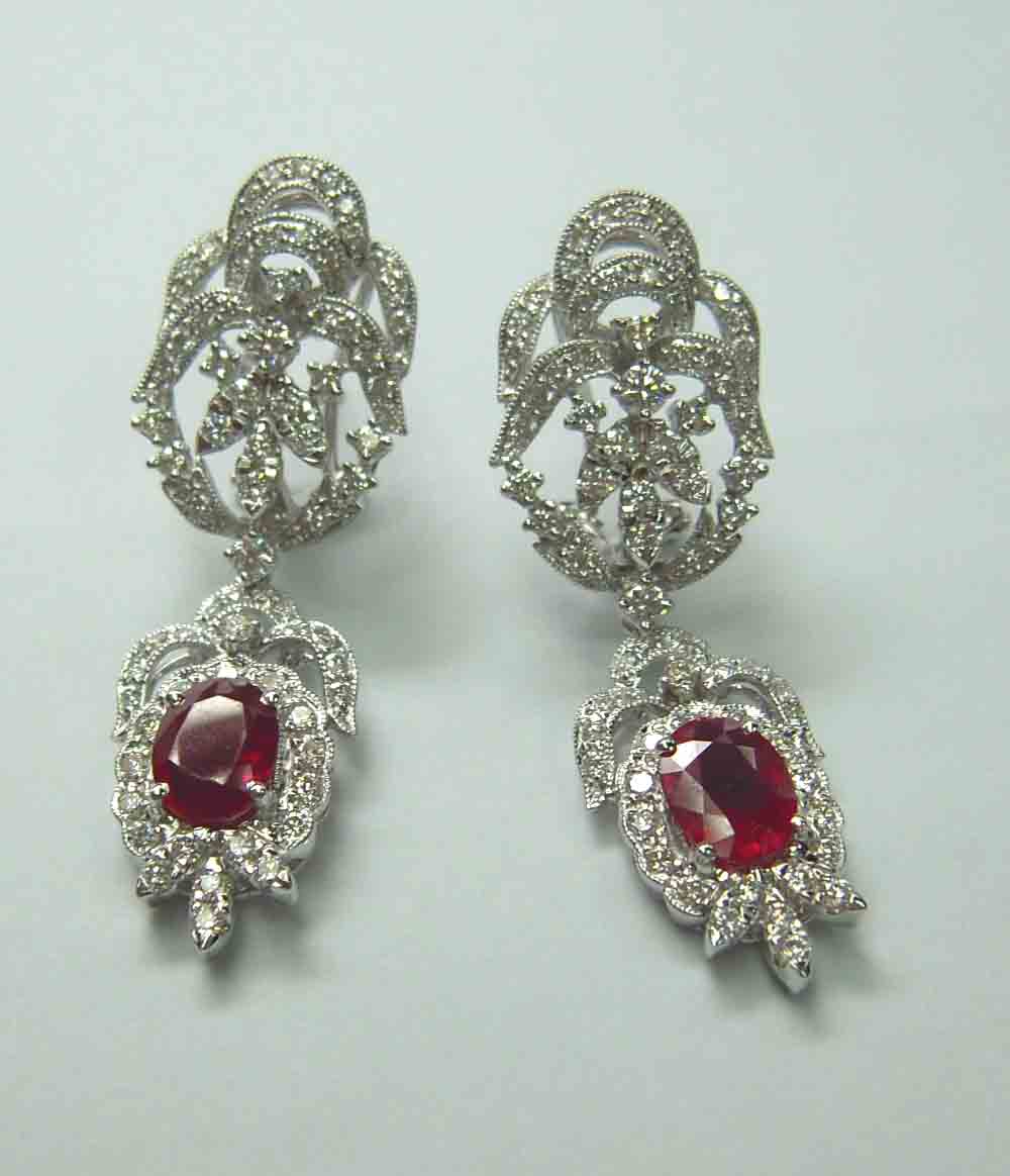 Incredibly designed, this dazzlingly gorgeous pair of drop earrings is your stellar choice. Earrings are crafted of 18-karat white gold with diamond. Dropping from the sparkling diamond deisign is a shining ruby.You will fill any occasion full of light and glitter with this fabulous pair of earrings.
