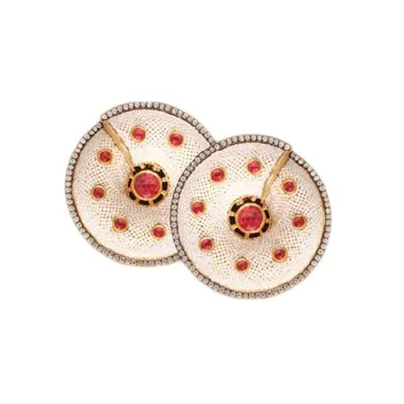 The fashion earrings feature a disc shape adorned with golden rimmed rubies. The outer rim is embellished with loose stones, featuring flattering brilliance. Look glamorous with a retro tinge by wearing this pair of ruby earrings.