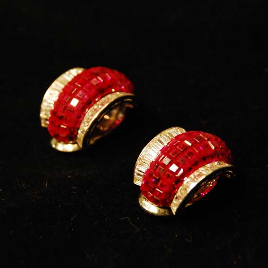 The gorgeous round-shape earrings feature an 18K gold construction with platinum plating. They are adorned by ruby and diamonds to give brilliant luster. Accessorize an elegant evening look with these sparkling earrings.
