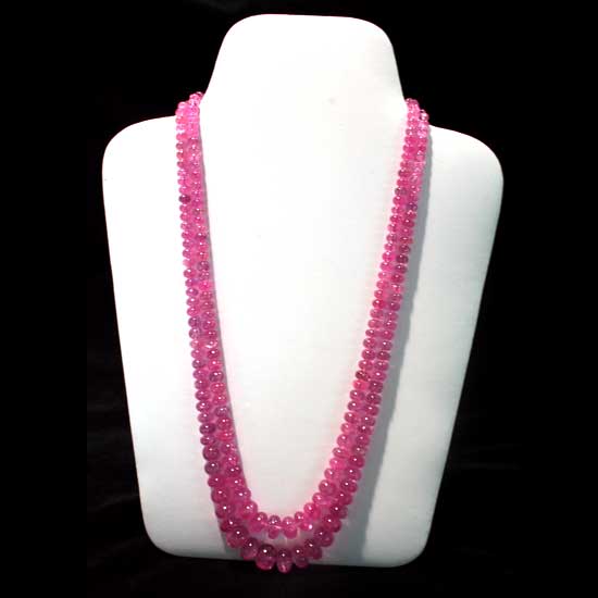 The ravishing ladies' necklace bestows a double-stranded design. Meticulous craftsmanship is revealed without reservation by the finely cut ruby stones. The high-luster ruby stones flaunt consistent shape and hue, radiating a sense of balanced beauty. This stunning ruby necklace makes a bewitching piece of jewelry for accentuating your evening dresses.