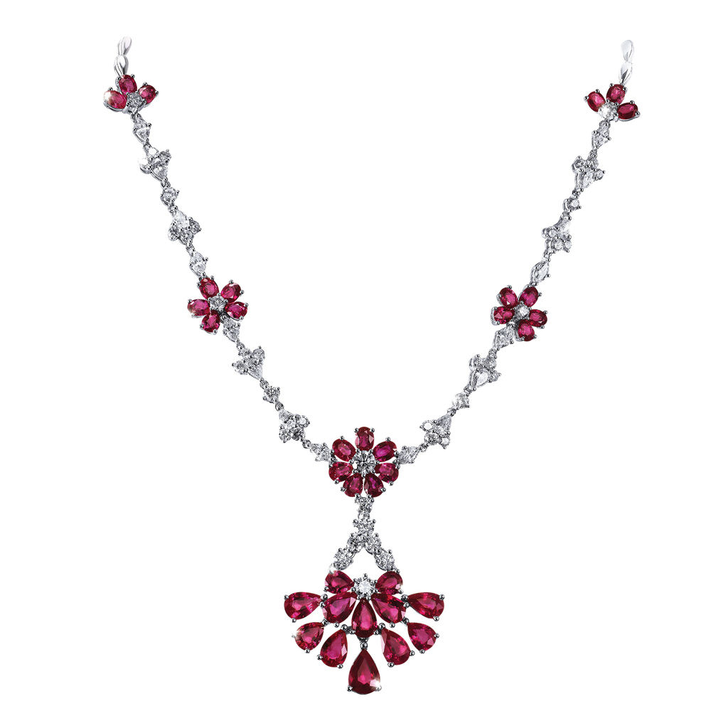 Shining with radiating brilliance, this romantic white gold necklace is a dream for every lady. Calling attention to its delicate craftsmanship, the sophisticated piece boasts a lavish statement with floral motifs of dazzling diamonds and rubies placed along the chain. Rounded off with a stunning cluster of pear-shaped rubies, the cherry blossom-inspired piece is a perfect accessory for spring cocktail parties.