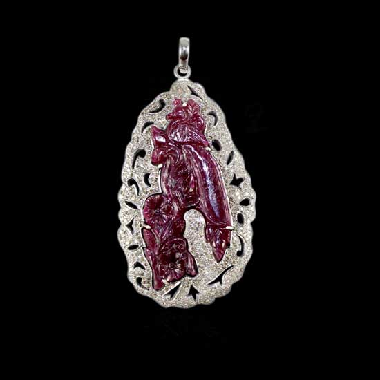 This is a ruby pendant mounted on shiny sterling silver. The ruby is finely carved for an artistic look. This beautiful pendant is adorned with diamonds for a fashionable touch.