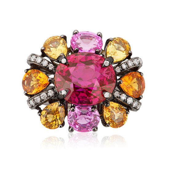 This showcased ring is characterized by its luxurious design and bright colors. It is finely made with dazzling diamonds, ruby stones and multi-colored sapphire stones for added elegance. This ruby sapphire ring is surely an ideal addition to complete your jewelry box.