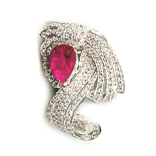 This is a brooch with a deluxe and elegant look. It is masterfully paved with sparkling diamonds for a more charming appearance. The red ruby stone accents this design for added glamor.