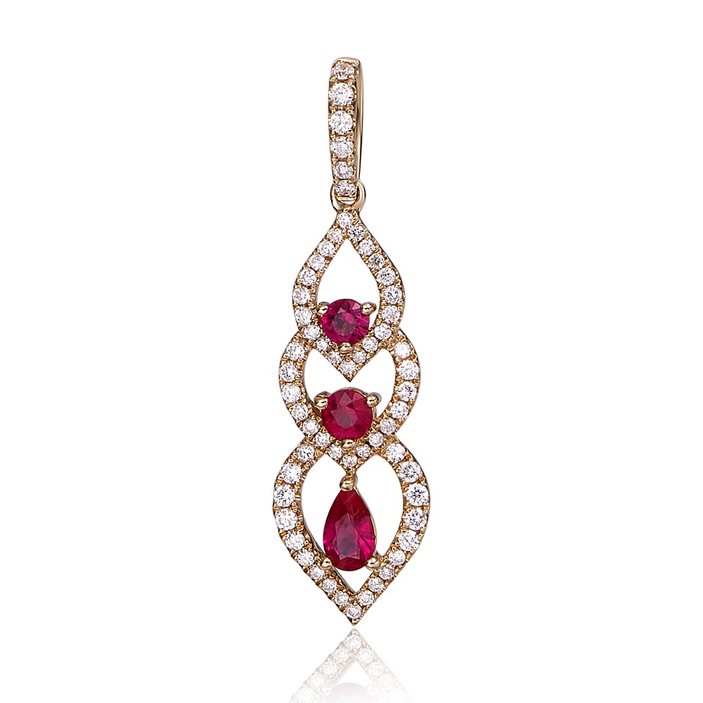 Ruby & Diamond Pendant Collection – Showcasing vibrant red rubies symbolizing passion and strength, beautifully accented with shimmering diamonds for a refined brilliance. Designed in elegant styles including butterfly motifs, cascading drops, and intricate vintage patterns, each piece is expertly crafted in premium metals such as white gold, yellow gold, and rose gold. Perfect for adding a bold yet timeless touch to any outfit, these pendants make stunning statement pieces for both everyday wear and special occasions.