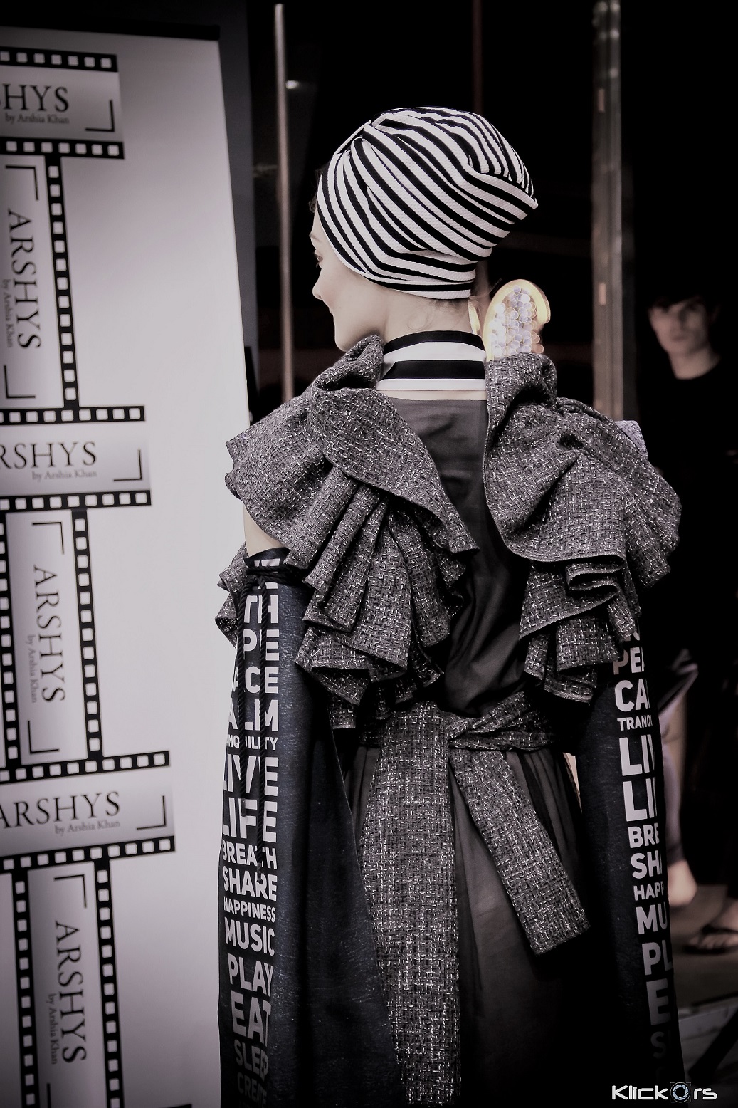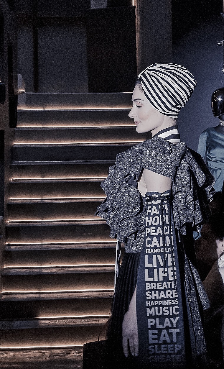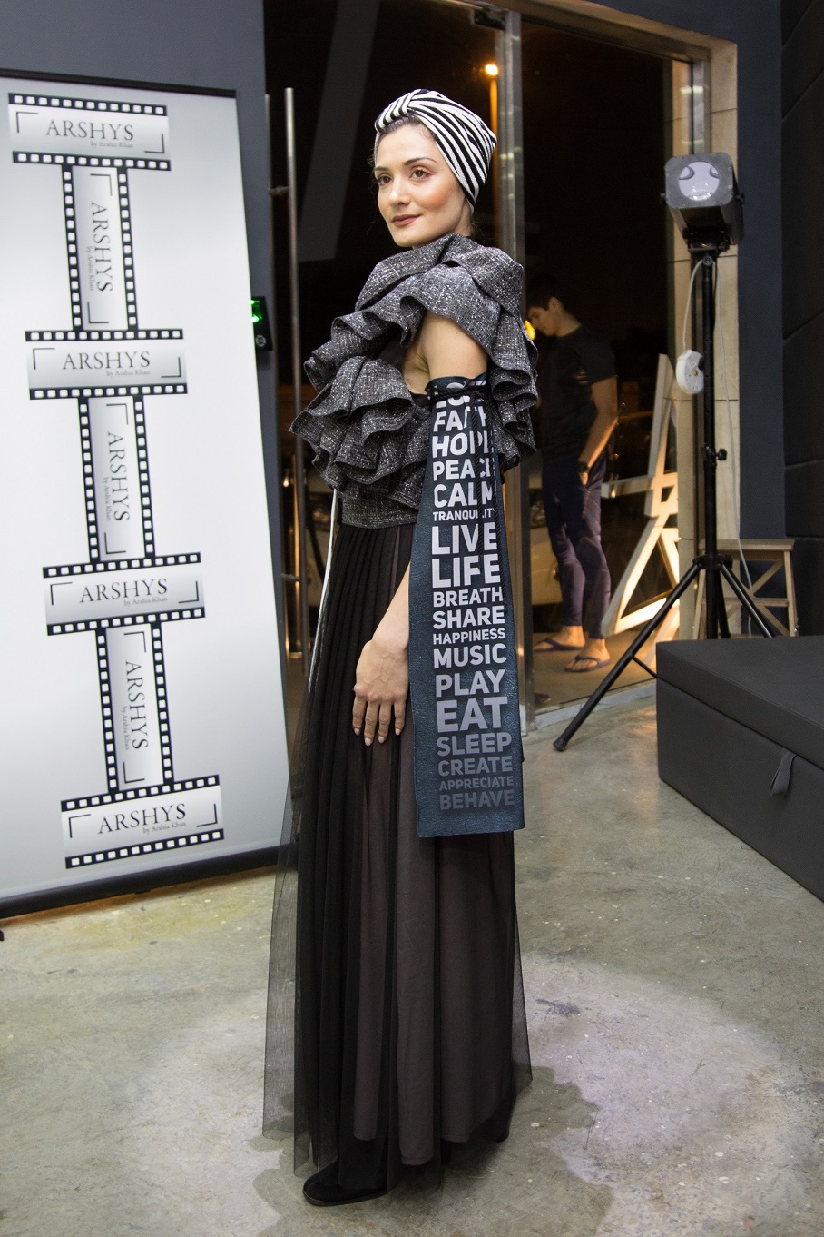 • Tweed fabric is ruffled and sprinkled over with Swarovski crystals. Statement sleeves tied over the arms with ropes that are detachable serves to positively reinforce message of love, peace and hope in our every day lives.