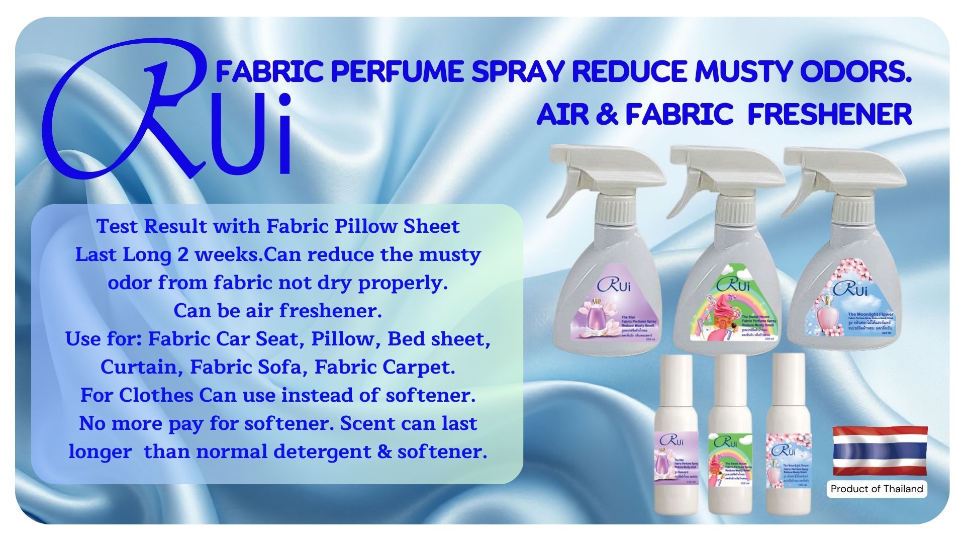 Reduce Musty Smell, Use with Shoes, curtain, bed sheet, pillow, car fabric seat, car air freshener, blanket, Fabric Sofa and use instead of softener for good smell in laundry shop.