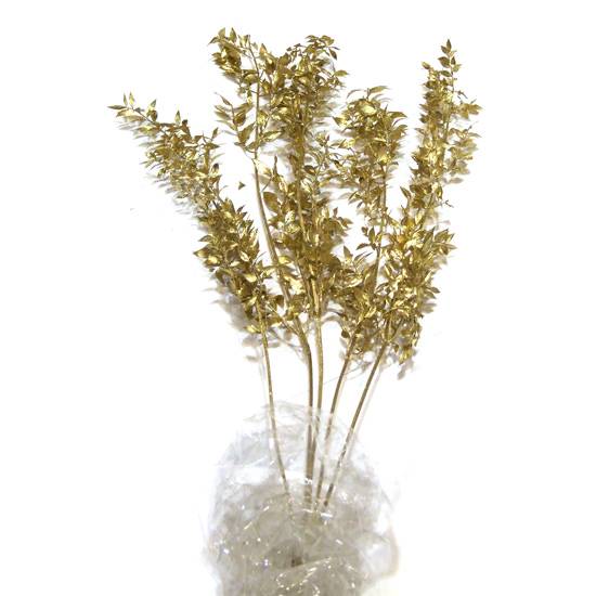 As shown are leaves of natural Ruscus. They are well-coated with glittering gold colour. There are altogether 90 colours available. They are ideal materials for decorative purposes, especially for Christmas decoration.